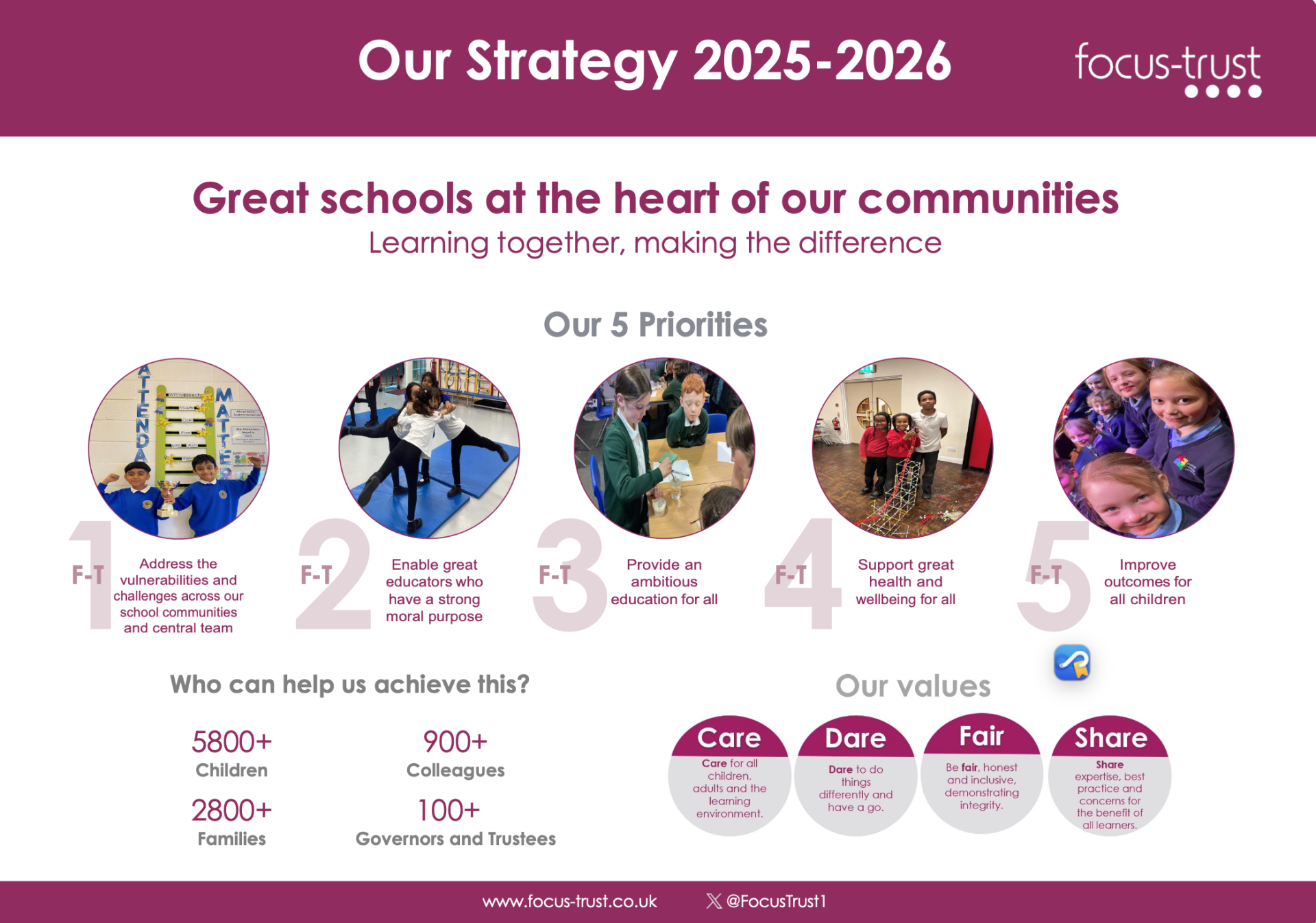 Our Trust vision is to have ‘Great schools at the heart of our communities’. To support us in realising this vision, we have agreed what makes Focus-Trust unique in eight different aspects outlined in our blueprint. We have also agreed five strategic priorities that our Trust Board, Central Team, Governors and all colleagues in our fifteen schools collectively work to achieve which are outlined in our strategic improvement plan.